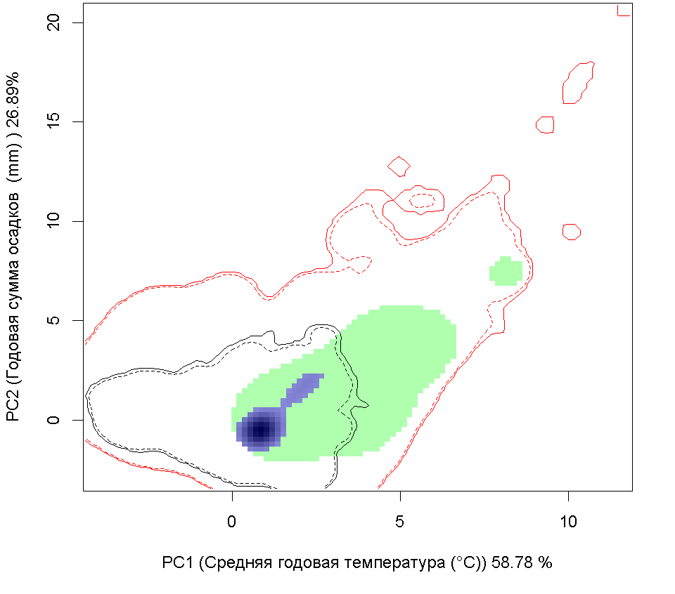 Графическое представление перекрывания ниш нативной и инвазионной частей ареалов, а также при сценариях изменения климата