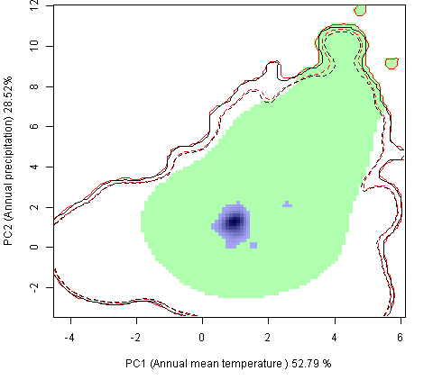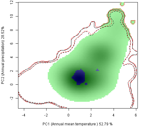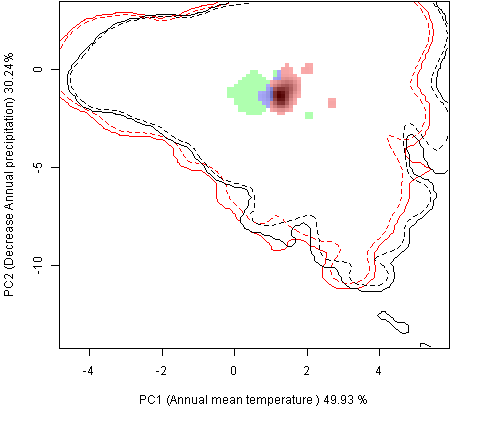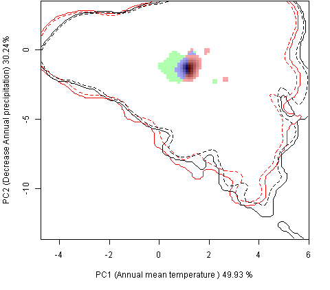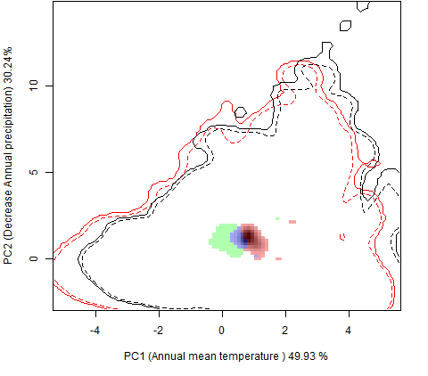 Графическое представление перекрывания ниш нативной и инвазионной частей ареалов, а также при сценариях изменения климата |