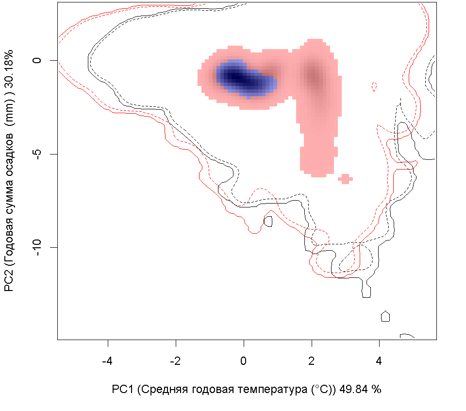 Графическое представление перекрывания ниш нативной и инвазионной частей ареалов, а также при сценариях изменения климата
